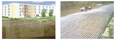 该方案只需在建筑物的旁边空地、道路或停车场等地方打地埋孔,将换热器埋至土壤中,利用水的循环和地下土壤换热,提取蕴含于地表浅层热能作为空调热源,将能量在空调室内和地下土壤之间进行转换。通常有立式埋管和水平埋管两种,立式埋管适用于可利用面积小,水平埋管适用于具有较大利用面积的场合。该方案不需要直接抽取地下水,不会对本地区地下水的平衡和地下水的品质造成任何影响,不会受到国家地下水资源政策的限制,具有环保、节能、能源可再生、安全可靠的特点。